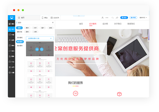 根据自己喜好打造网站专属风格,修改图文,创建模块,更改模板背景无拘无束自由调动素材库丰富素材